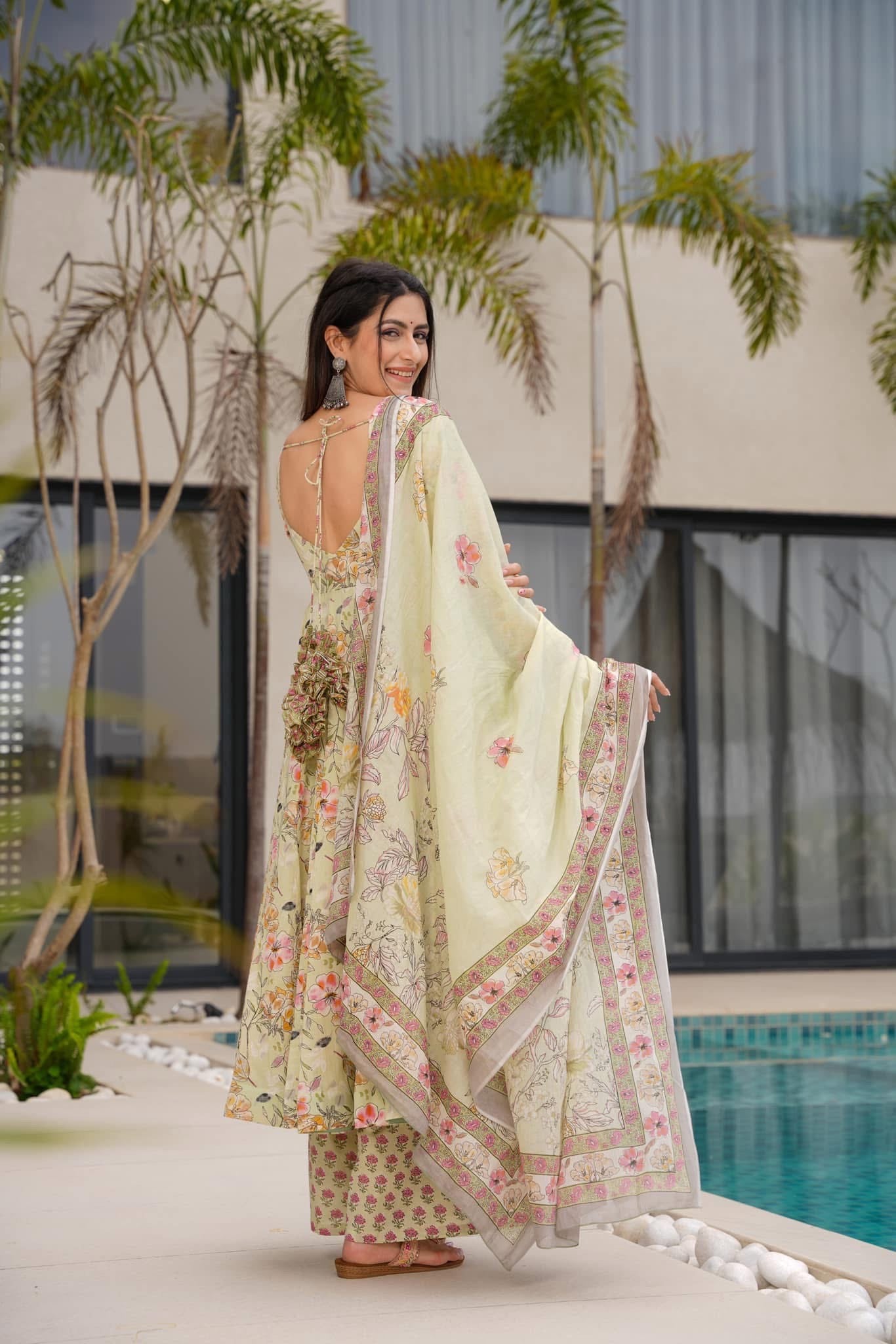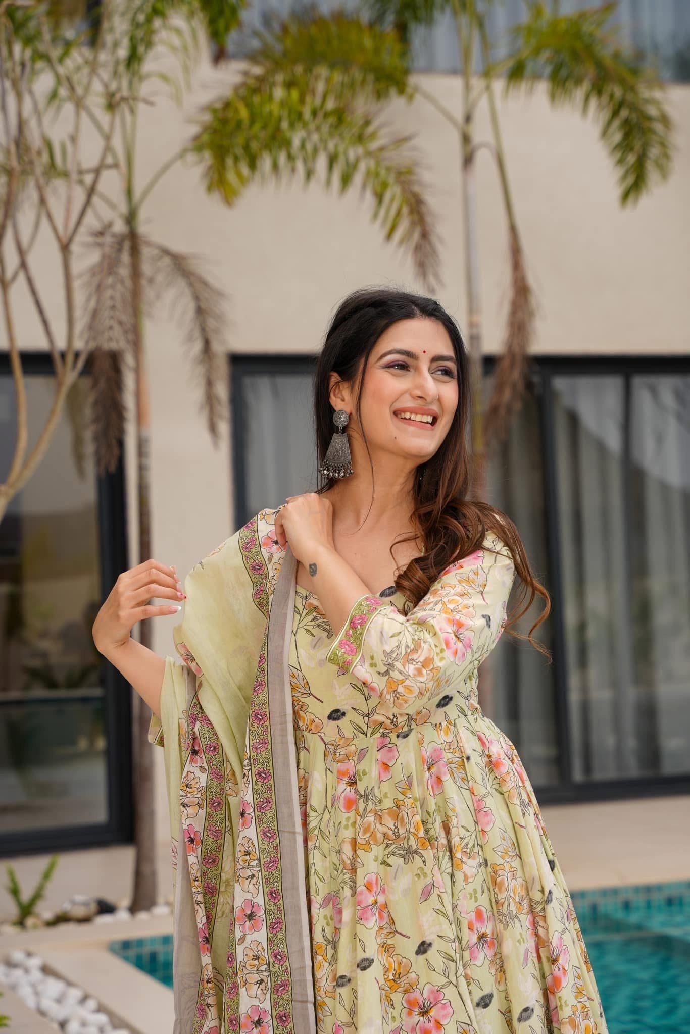 Absolutely loving this outfit!💚 The floral prints, soft muslin fabric, and vibrant dupatta make it so elegant and comfortable. Feels like a perfect start for 2025!