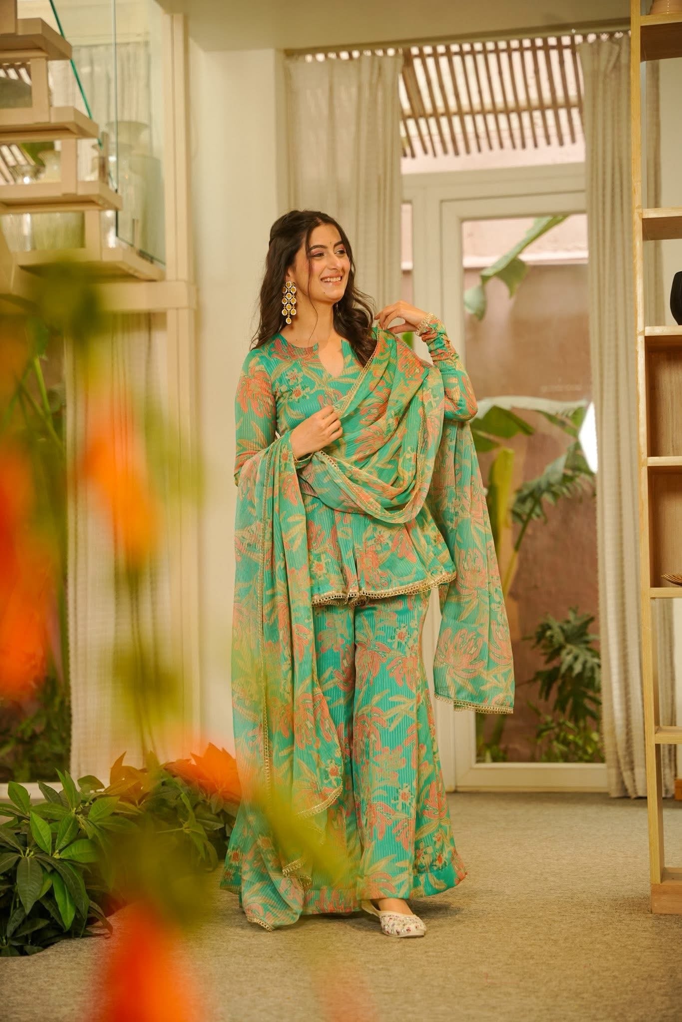 Absolutely loving this outfit!💚 The floral prints, soft muslin fabric, and vibrant dupatta make it so elegant and comfortable. Feels like a perfect start for 2025!
