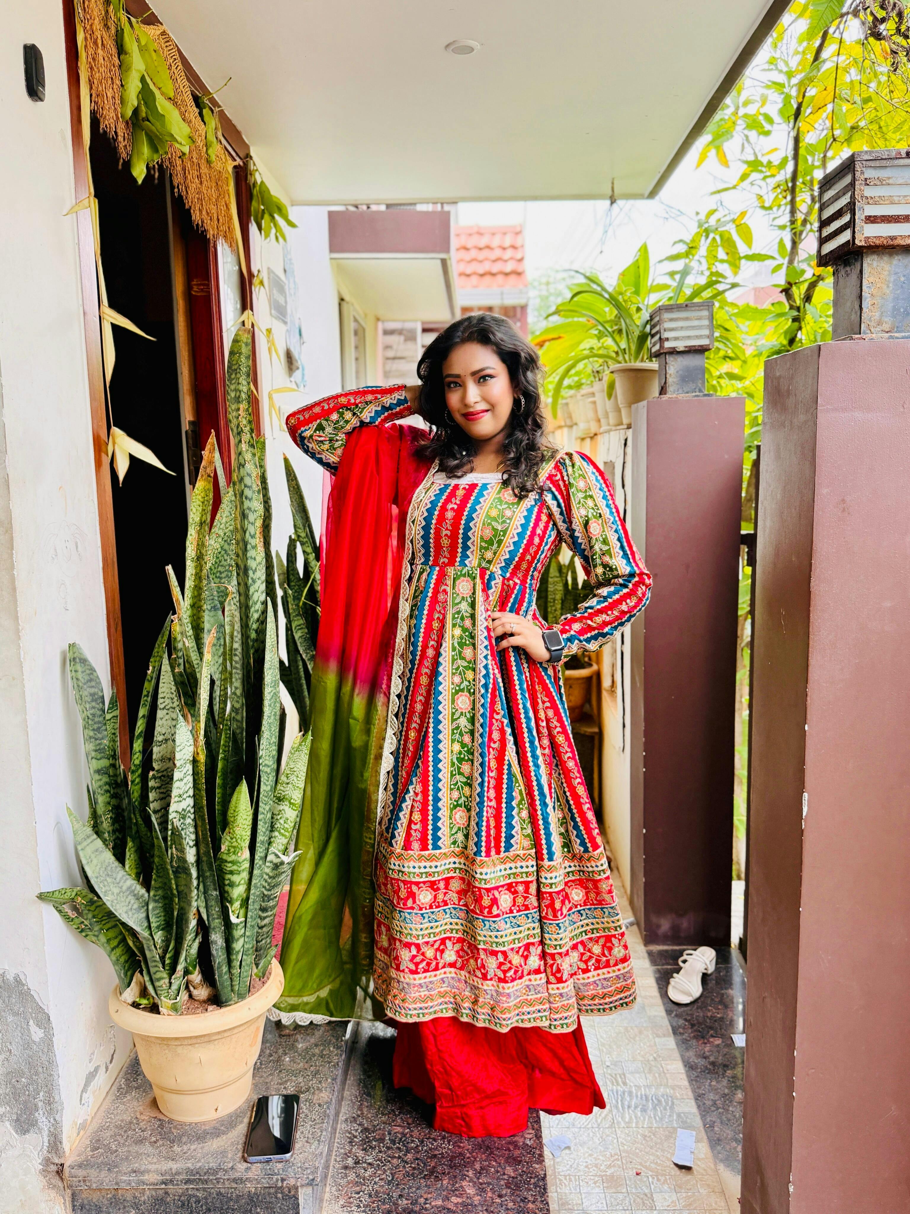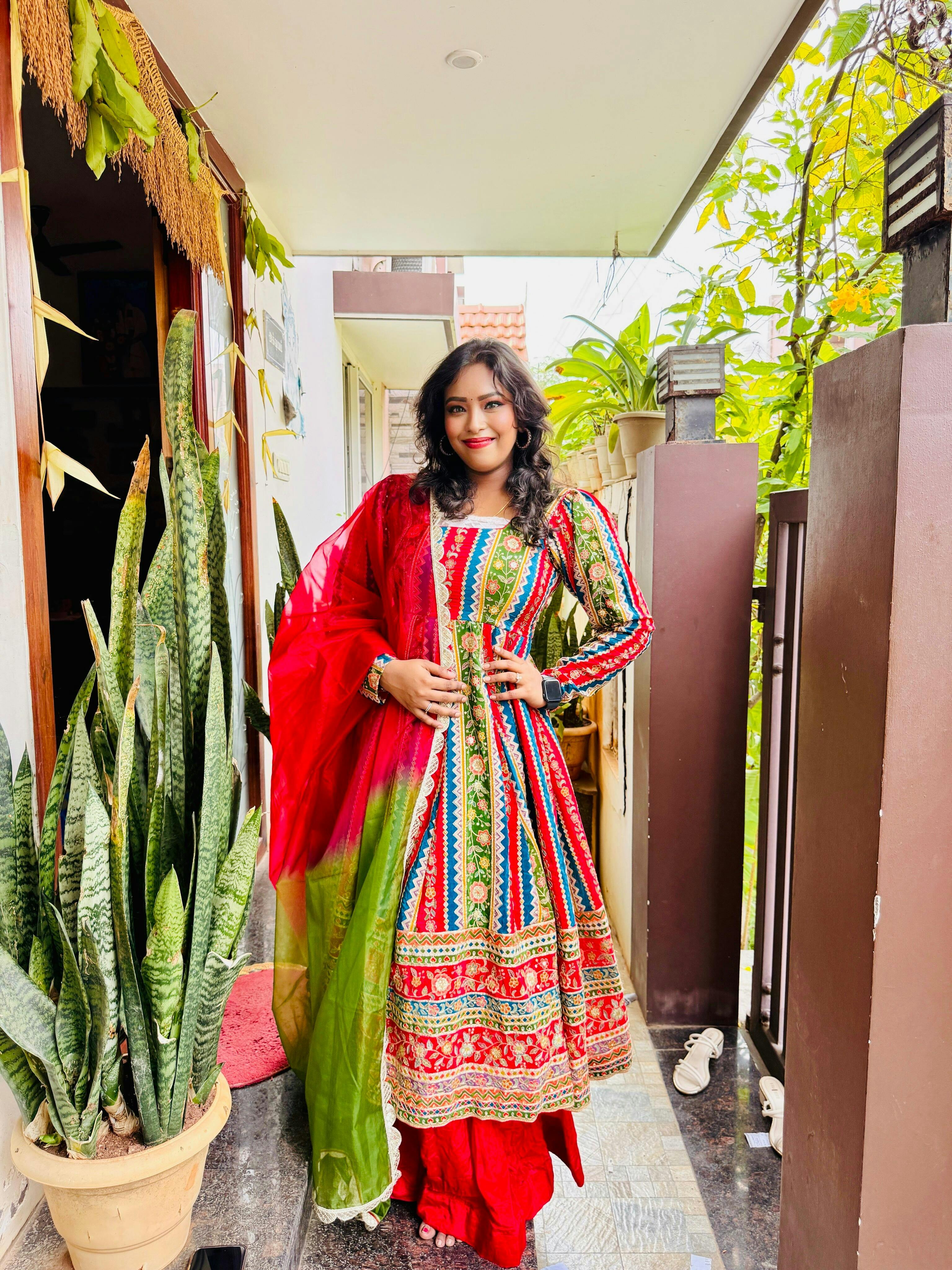 This Diwali, I had the pleasure of adorning a breathtaking red Anarkali suit by Idaho, exquisitely interwoven with vibrant multicolour accents and gracefully contrasted with lush green detailing. It wasn’t merely a dress it was a celebration of heritage, craftsmanship, and emotion.